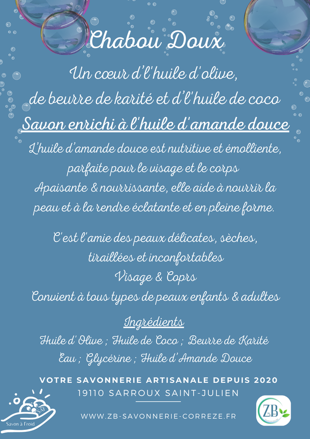 S0002 CHABOU Ingrédients INCI : Sodium Olivate, Sodium Cocoate, Sodium Shea Butterate, Aqua, Glycerin, Olea Europaea Fruit Oil, Prunus Amygdalus Dulcis Oil, Butyrospermum Parkii Butter, Cocos Nucifera Oil (Huile d'olive ; huile de Coco ; beurre de Karité ; Eau ; Glycerin ; huile d'amande douce)